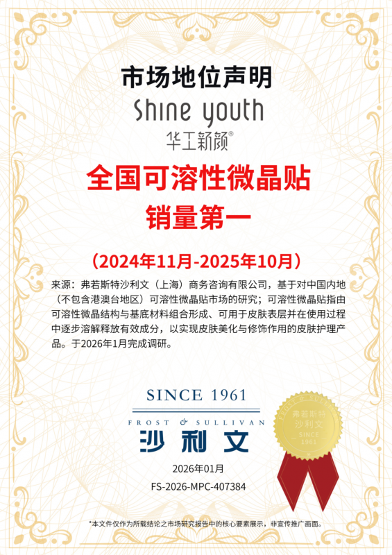 此次荣获弗若斯特沙利文市场第一的认证,是全体研发人员、合作伙伴与广大消费者共同支持的成果。华工新颜始终坚信,技术的价值在于赋能生活,我们将以此为契机,持续加大研发投入,深化与高校及科研机构的合作,推动可溶性微晶技术在医美护肤、医疗健康等更多领域的应用拓展,为用户提供更优质的产品与服务。作为国家高新技术企业、专精特新中小企业,华工新颜将始终坚守技术创新初心,秉持“品质为先、用户至上”的经营理念,不断突破行业技术瓶颈,推动行业标准化、规范化发展。未来,公司将加快国际化布局步伐,让本土可溶性微晶技术走向全球,助力中国医美护肤产业在全球市场占据核心竞争力,为行业高质量发展注入源源不断的动力。